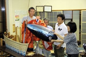 大漁祈願の公演ということで、阿南市のHPには大きな魚の模型を使った練習風景が!